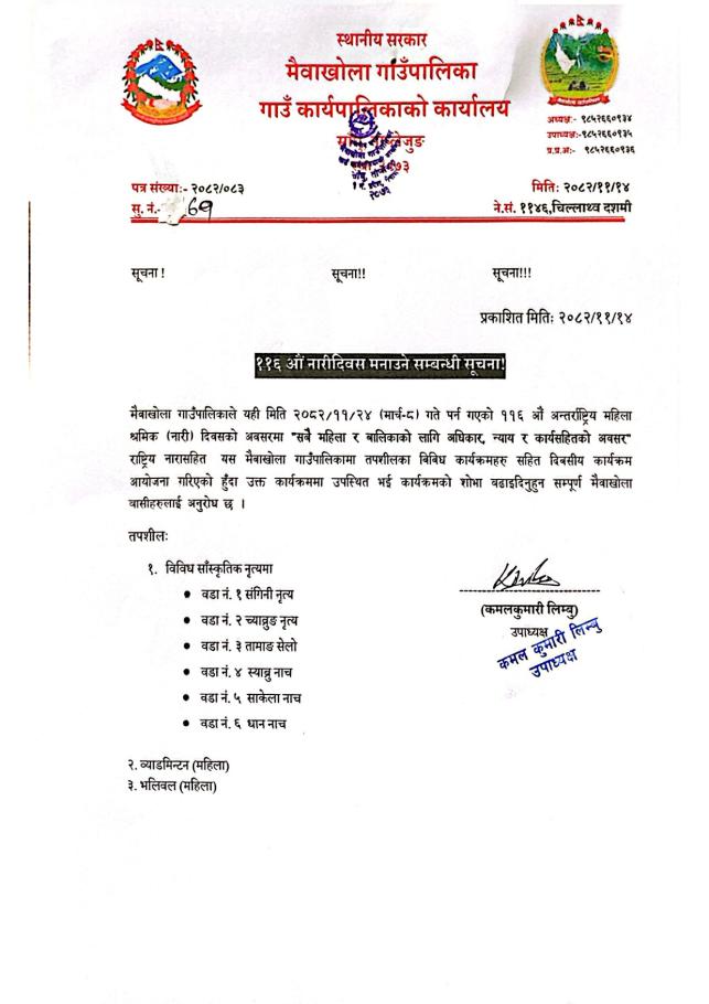 ११६ औँ नारी दिवस मनाउने सम्बन्धी सूचना !