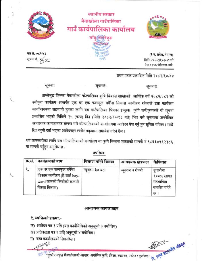 एक घर एक फलफूल बगैँचा विकास कार्यक्रम प्रस्ताव आवह्नान सम्बन्धी सूचना !