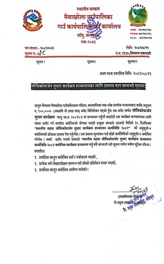 जीविकोपार्जन सुधार कार्यक्रम सञ्चालनका लागि प्रस्ताव माग सम्बन्धी सूचना !