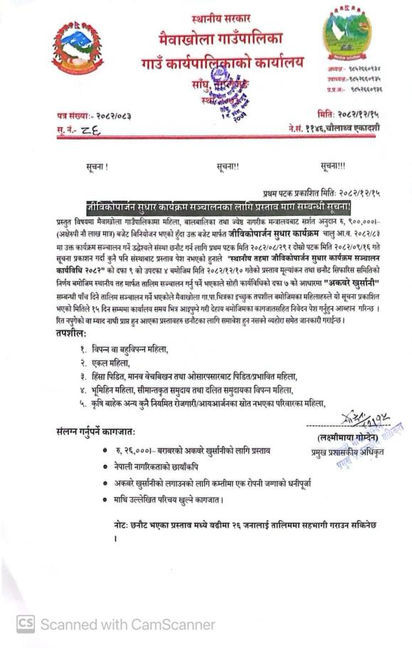जीविकोपार्जन सुधार कार्यक्रम सञ्चालनका लागि प्रस्ताव माग सम्बन्धी सूचना