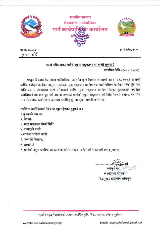 माटो परीक्षणको लागि नमूना सङ्कलन स‍म्बन्धी सूचना !
